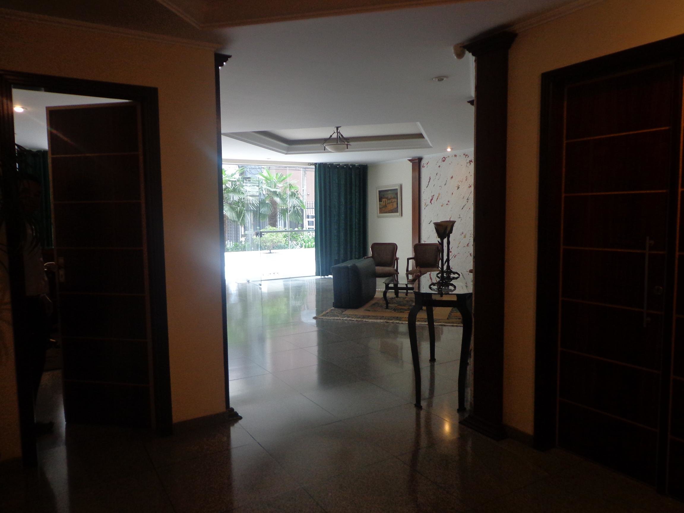 Sala para 2 ambientes em disnível com piso em madeira, lavabo com pia e o piso em marmore branco, corredor com armarios.