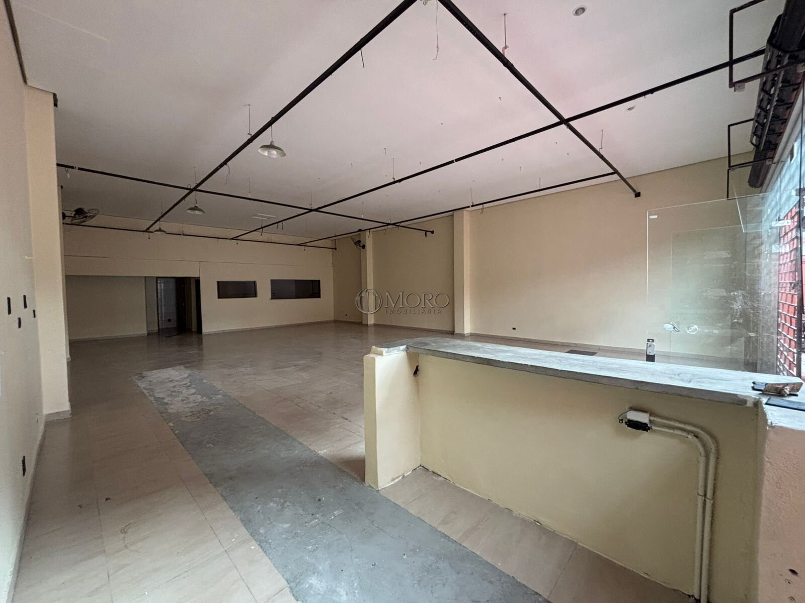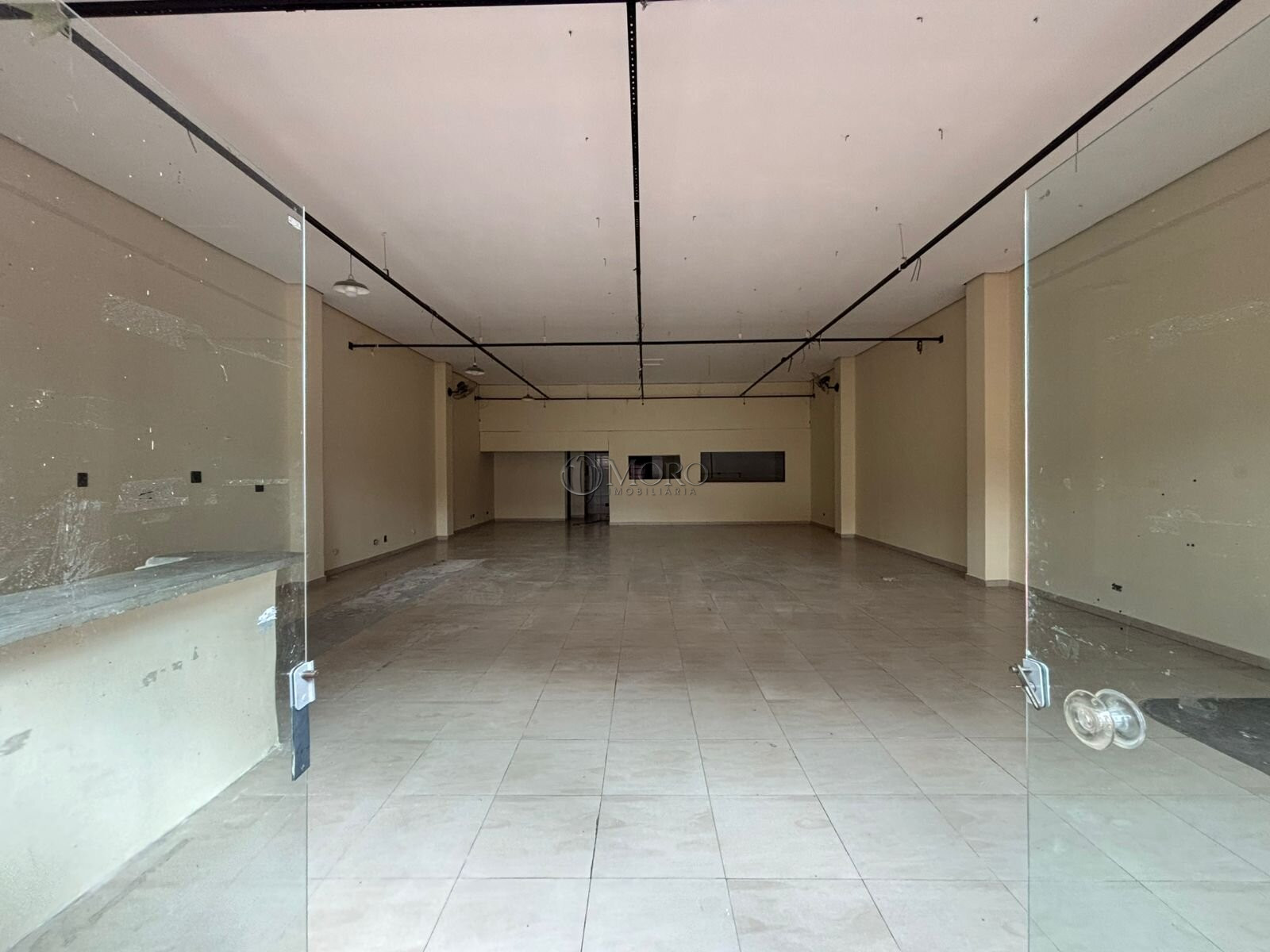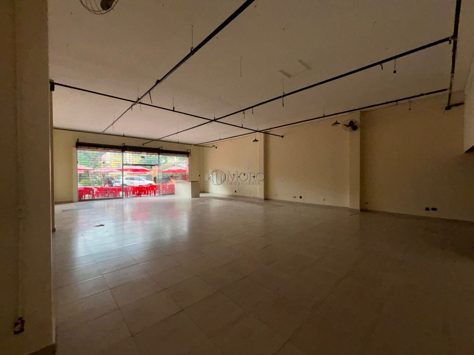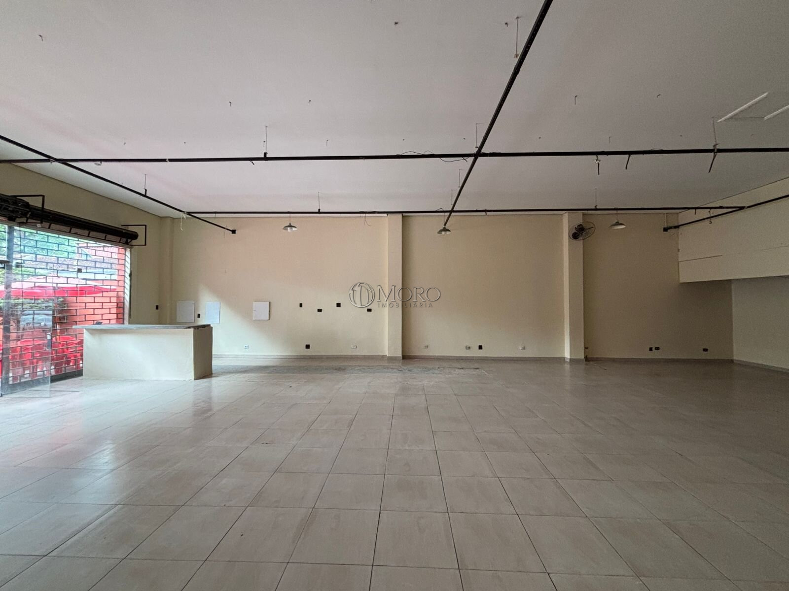 A loja está dividida em: 1 salão principal com amplo vão livre e pé direito alto, 1 sala, 2 banheiros, 1 cozinha, 1 área de serviço, 1 vaga de garagem e 1 recuo frontal destinado ao estabelecimento e recepção de clientes.