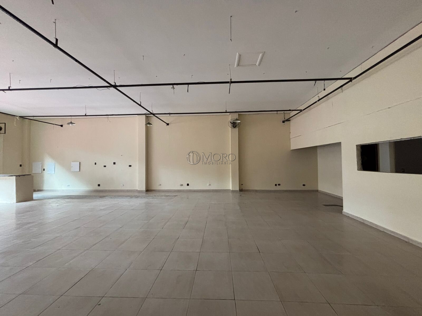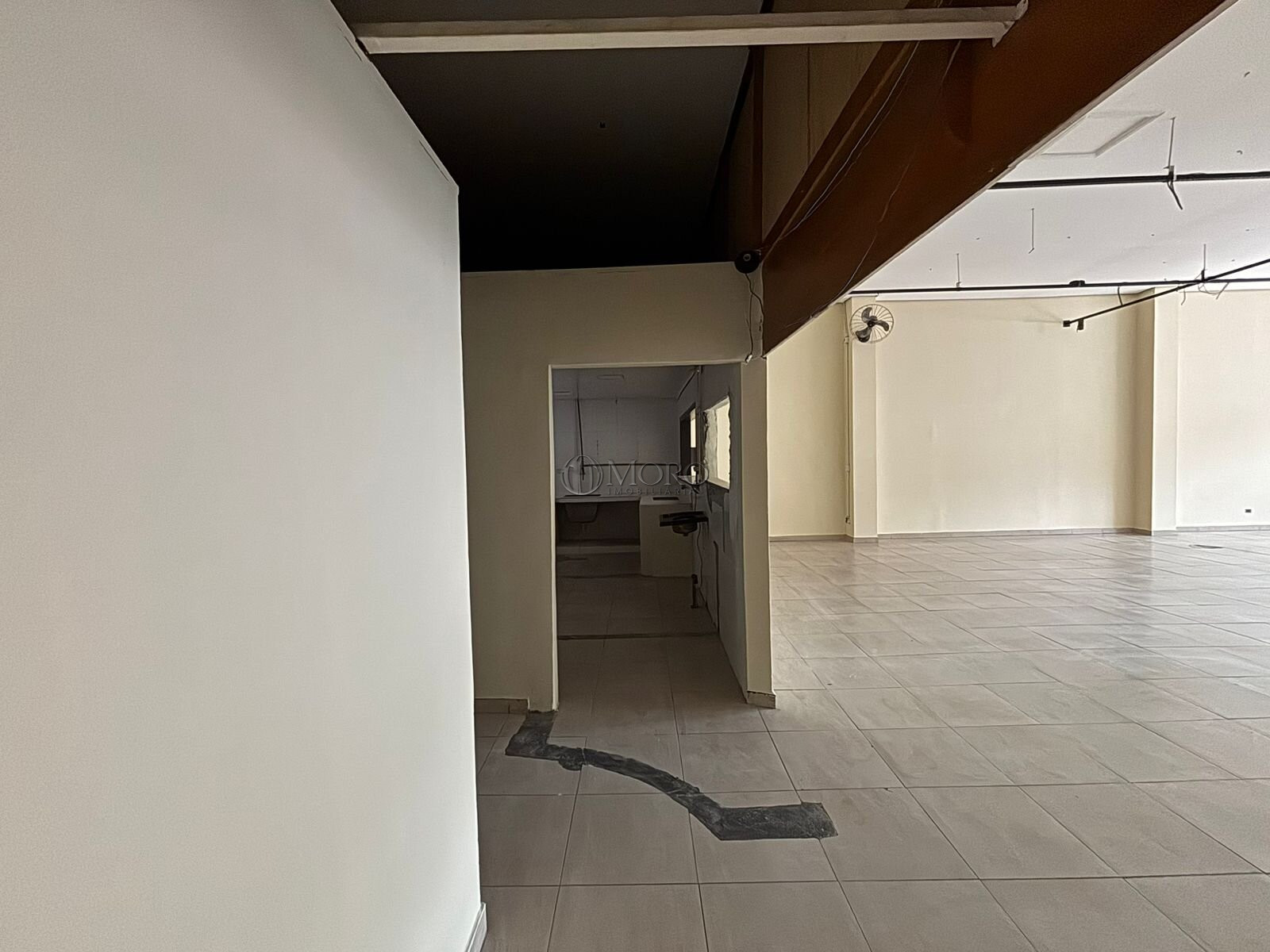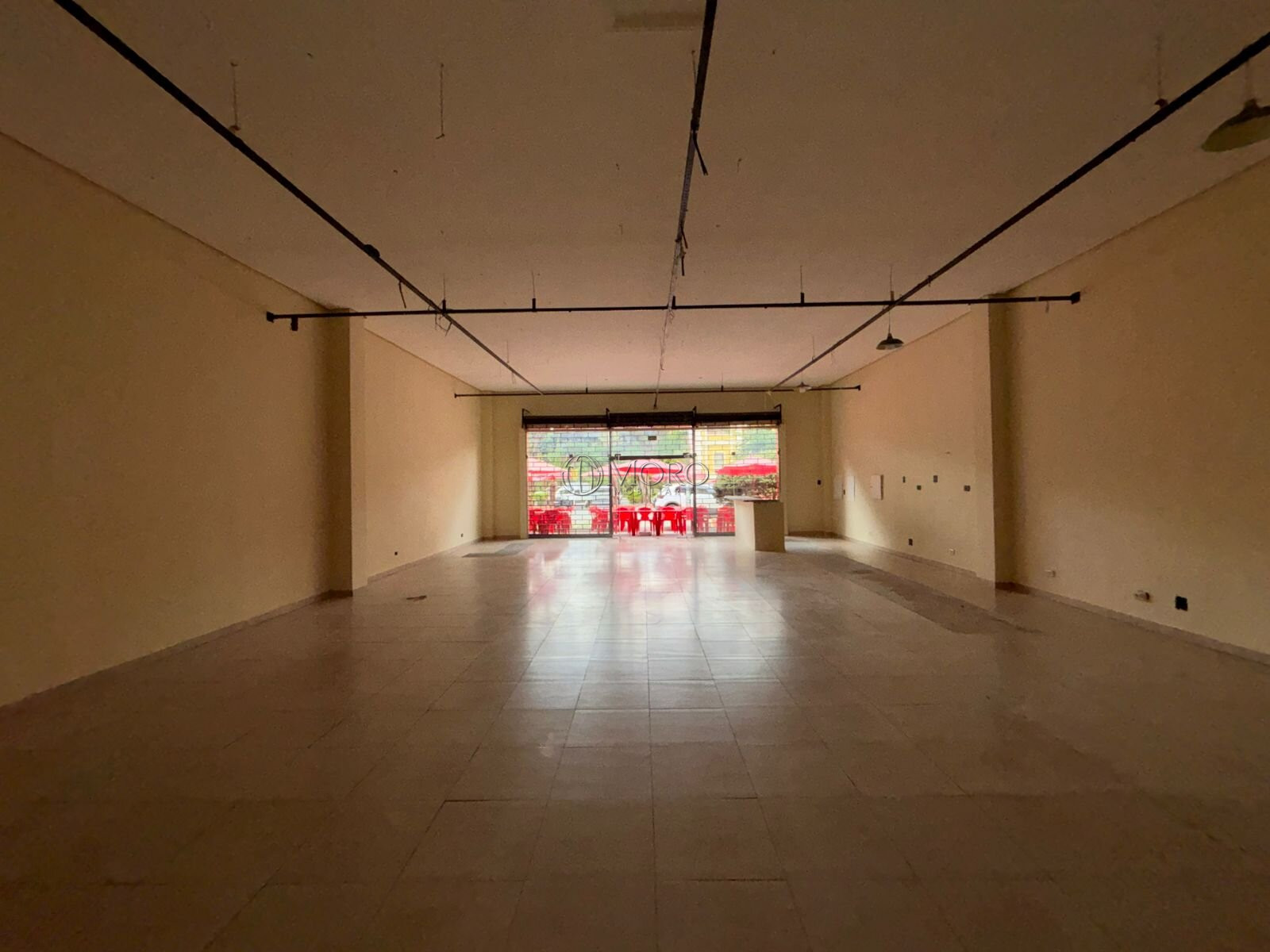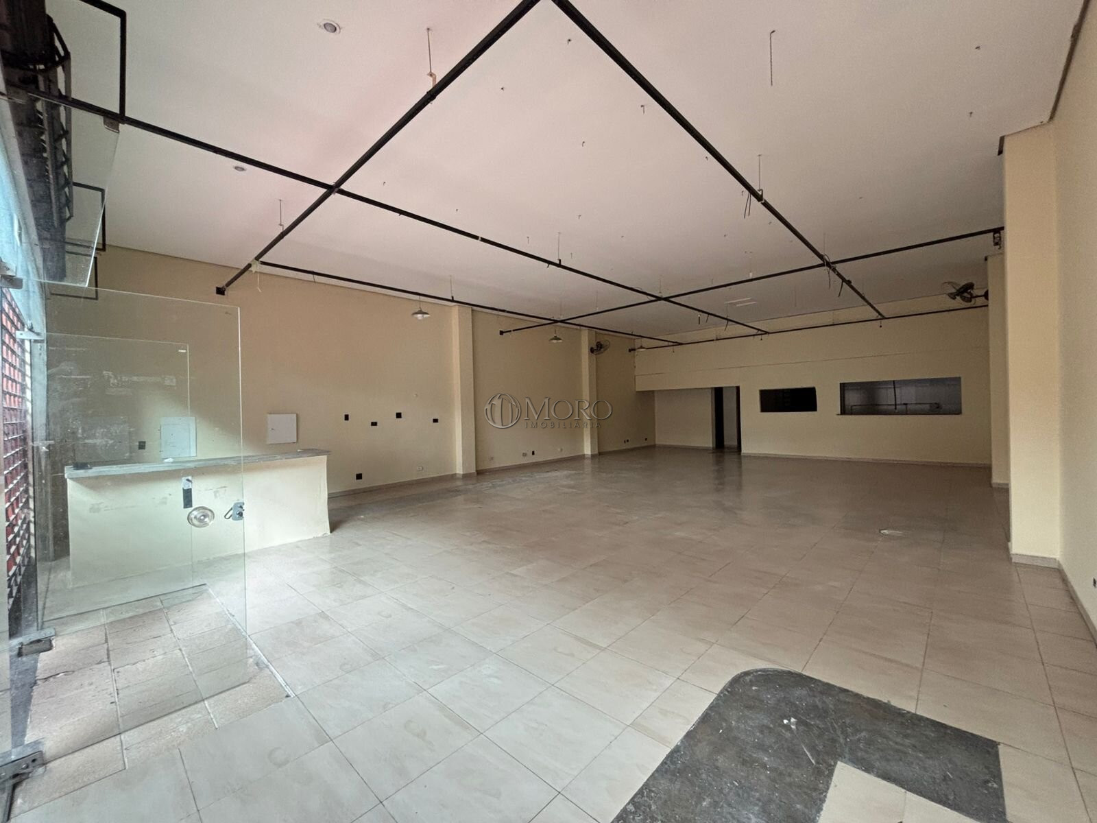 A loja está dividida em: 1 salão principal com amplo vão livre e pé direito alto, 1 sala, 2 banheiros, 1 cozinha, 1 área de serviço, 1 vaga de garagem e 1 recuo frontal destinado ao estabelecimento e recepção de clientes.